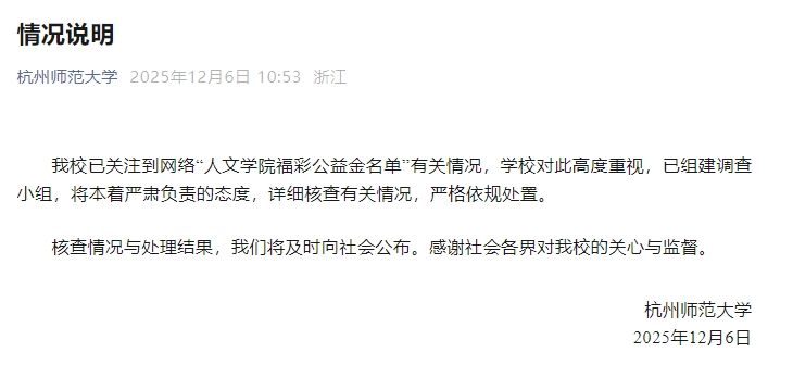 新京报讯 12月6日,杭州师范大学发布情况说明:我校已关注到网络“人文学院福彩公益金名单”有关情况股票配资炒股公司,学校对此高度重视,已组建调查小组,将本着严肃负责的态度,详细核查有关情况,严格依规处置。