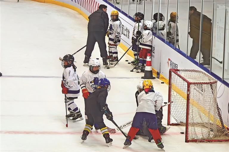 “尽量把球控制在自己身前。”“注意队友跑位,及时传球。”“有空间可以选择打门。”周末下午,创聚冰雪国际标准真冰场热闹非凡,冰球教练员指挥着场上的小球员。